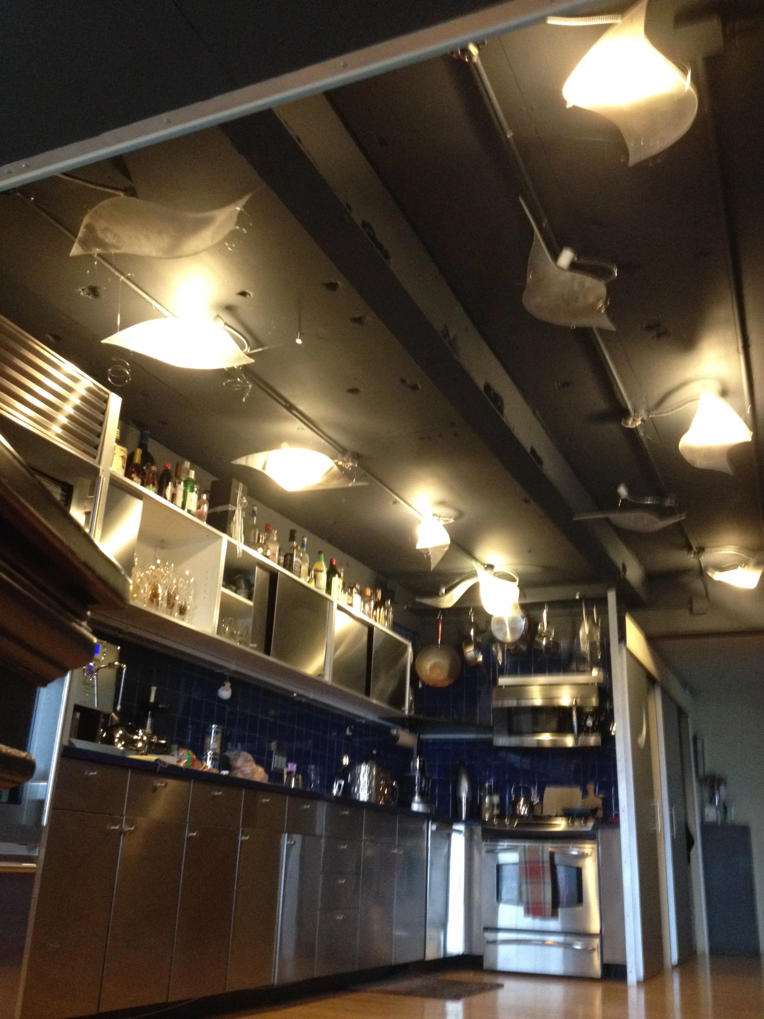 The Parris Landing loft complex located in the Charlestown Navy Yard was originally built as a bomb making factory to support the WWII war effort. It was divided into condominium loft spaces in the 1970’s and renovated again in the early 2000’s. The interior design is for an internationally ranked ballroom dancer for whom I had renovated two dance studios. The challenge was to install a large master bath without loosing the open loft feel. It is a place for post ballroom competition parties as well as a place to live. The loft occupies two top levels including a roof deck with expansive views of Boston Harbor. Having known the owner for many years, I had an understanding of his adventurous and playful style. The master bath is enclosed in a sculptural wall of red brick salvaged from door opening, frosted plexiglass and aluminum. The interior was stripped of all surfaces to expose the original brick walls and coffered concrete ceiling. The curved shape of the brick bath enclosure is taken from a Picasso reclining nude painting hanging in the Paris Picasso Museum.